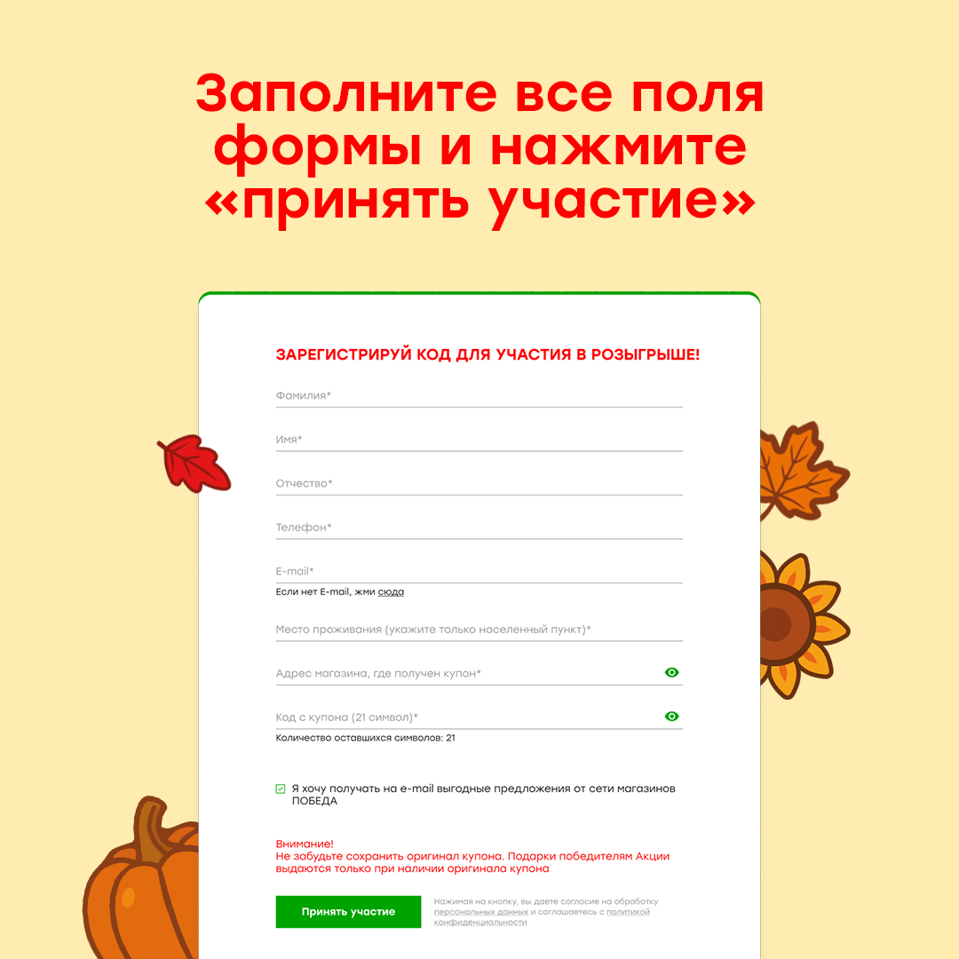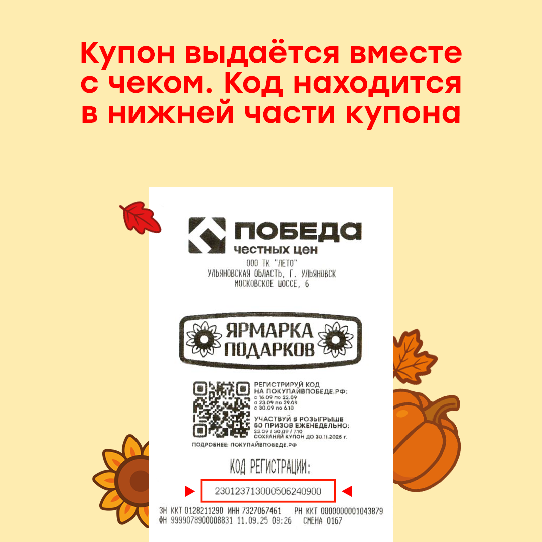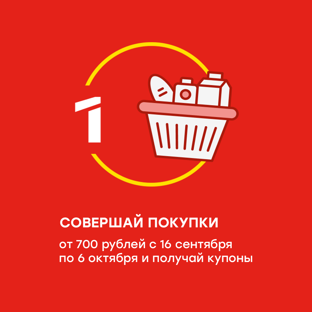 Единовременно приобрести любое количество товара в одном чеке на сумму от 700 рублей (без учета табака и алкогольной продукции) в торговой сети ПОБЕДА в период с 16 сентября по 6 октября 2025 года включительно. Сохранить чек, подтверждающий покупку. Зарегистрировать на сайте покупайвпобеде.рф код с купона. Сохранить купон до конца акции.