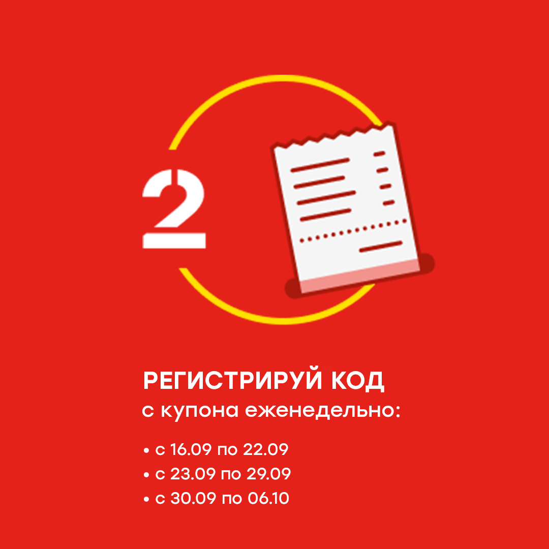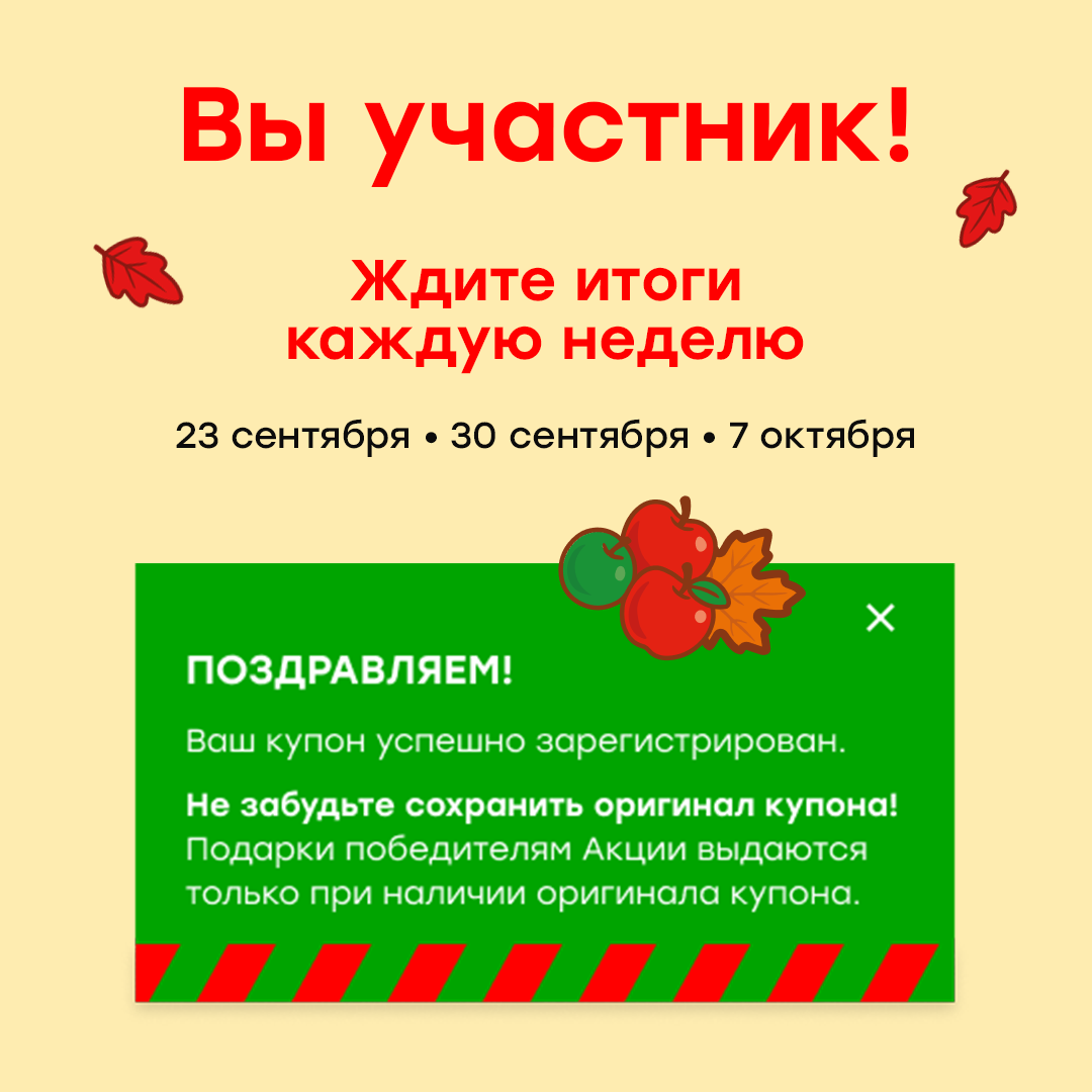 Всего за Акцию (с 16.09.2025 по 6.10.2025) один участник может зарегистрировать не более 150 (сто пятьдесят) Купонов Акции.